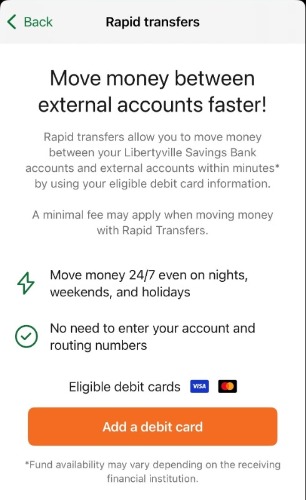 Users can add their debit card from another bank and transfer funds instantly to and from the account that card is attached to. The online banking user must be an owner on both the LSB account and the on the debit card being entered.
